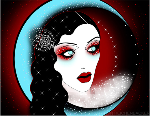 Saffron Reichenbacker is a Brighton based Artist inspired by a dream world of silver screen vamps, friendly ghouls & Weimar Berlin ghosts. She works primarily with ink sketches, which are then scanned and developed digitally. Using strong lines and bold colours, her pieces commonly take the form of imagined portraits. In these, she creates a mood that brings to life her dark dream vision of the 1920s. Saffron has exhibited in the UK, Italy & America. She loves cats, aerial circus and damn fine coffee.